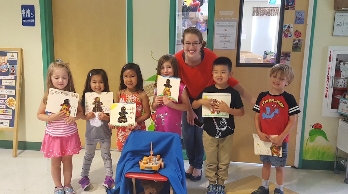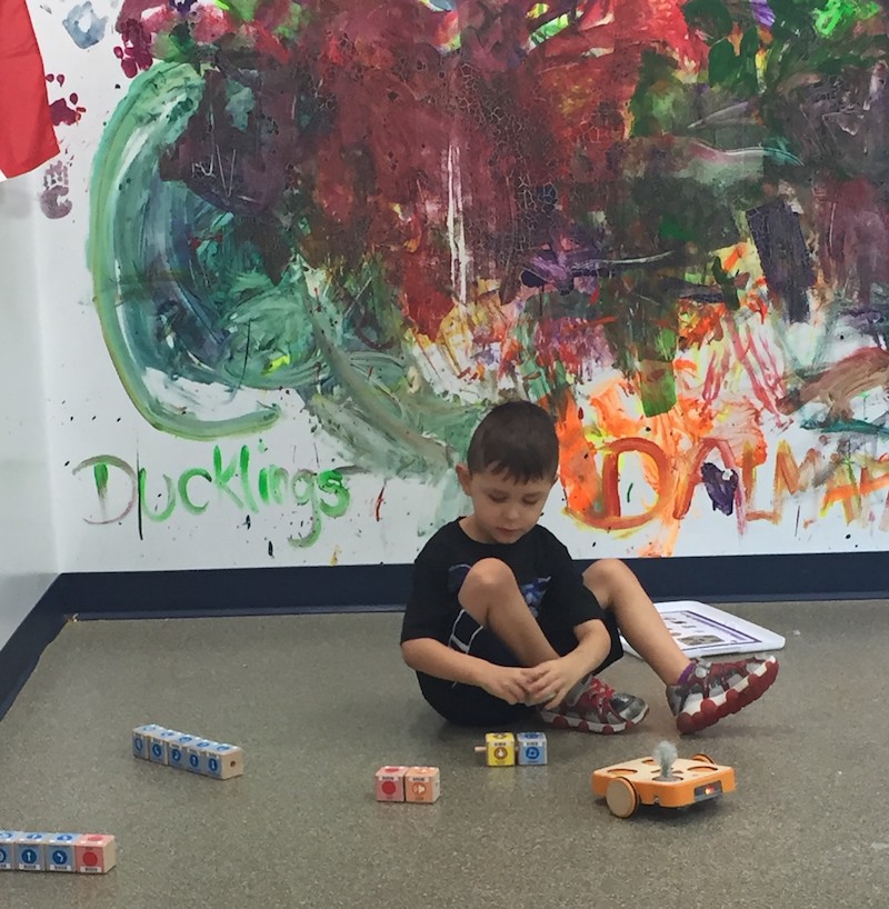 During the month of August, we completed our last week-long KIBO Robotics Camp here in Washington state. We used the children’s book “We’re Going on a Bear Hunt” as our theme for the week. The children mapped out the road to the bear cave on a long strip of white banner paper. We then colored in The River, The Forest, The SnowStorm. We used the Expression module for each team to make a picture of their “person” going on the bear hunt. Children then coded their KIBO robot to navigate through the road. We used the KIBO’s Sound Recorder/Playback Module to record the children saying: